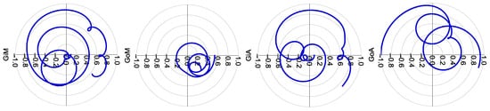 According to the Ohtomo approach, the Nyquist method was applied, considering the number of clockwise rotations around the point 1 + j0 of the Nyquist plot of the open loop functions (, , , and ), simulated adopting the setup shown in Figure 9, using ideal circulators at the gate and drain nodes. The Nyquist plots are shown in Figure 10 for frequency going from DC to 6 GHz. As shown, none of them enclosed the 1 + j0 point; therefore, the proposed DPA was stable.