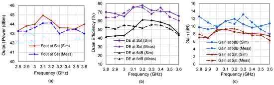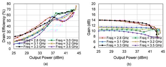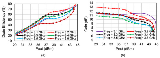 The simulated drain efficiency and gain versus output power over the target frequency range are presented in Figure 11. As shown, drain efficiency was above 44% over the 6 dB back-off region, and the maximum output power was approximately 44 dBm.
