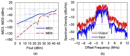 In addition, the linearity of the DPA was assessed in simulation. A two-tone analysis was first performed to evaluate the third and fifth Intermodulation Distortions (IMD3 and IMD5), which are plotted in Figure 12a as a function of input power. As shown, IMD3 and IMD5 were below −18 dBm and −34 dBm, respectively. To test instead the system-level behavior, the designed DPA was simulated under a modulated signal adopting a 16-QAM signal with a 5 MHz bandwidth and 6 dB PAPR. Figure 12b illustrates the simulated input and output power spectra at the center frequency of 3.3 GHz for an average output power of 36 dBm. As shown, the Adjacent Channel Power Ratio (ACPR) was less than −32 dBc. which compares well with the state-of-the-art [9,31], at least in simulation.