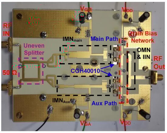 The photograph of the fabricated DPA is shown in Figure 13. For the DPA characterization, the gate voltages of the main and auxiliary amplifiers were set to − V and −5.5 V, respectively, while the drain voltage was 28 V. The quiescent drain current was 68 mA.