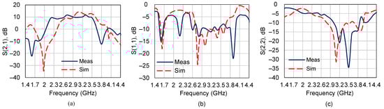 Simulated (dashed) and measured (solid) scattering parameters of the proposed DPA (a) , (b) , and (c) .