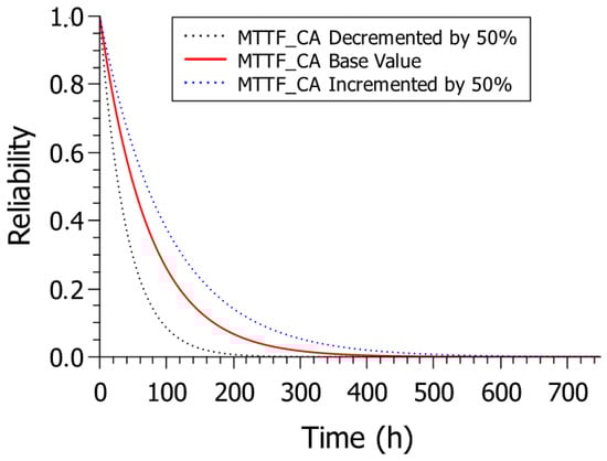 MTTF_CA using less 50% of the base value, the model obtained the lowest reliability, which presents approximately 0% reliability after 250 h of service. With the base value of