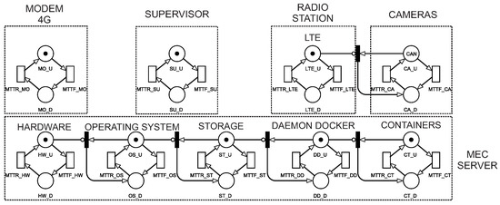 19] to represent and evaluate the dependability (availability and reliability) of surveillance monitoring systems in smart cities. SPN models were proposed by researchers active in the applied stochastic modeling field, with the goal of developing a tool which allowed the integration of formal description, proof of correctness, and performance evaluation. For what concerns the last aspect, the proposals aimed at an equivalence between SPN and continuous time Markov chain (CTMC) models. This way, SPN is superior compared to CTMC in terms of intuitive representation capabilities. SPN can be used to model any complex systems because it can model, for example, process synchronization and parallelism. The SPN models are based on a CCTV architecture, using LTE connection, and a server at the edge of the network (mobile edge computing—MEC).