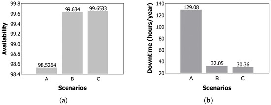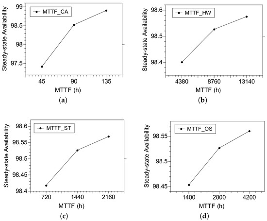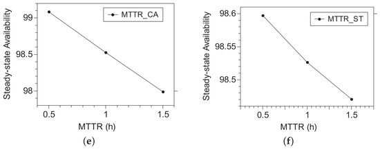 Figure 5e,f show that increasing MTTR reduces availability. The variation in the model parameters provides an overview of the system’s behavior.