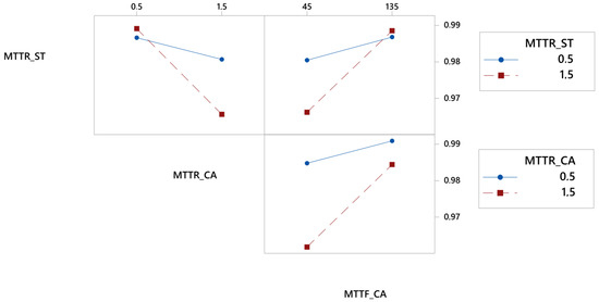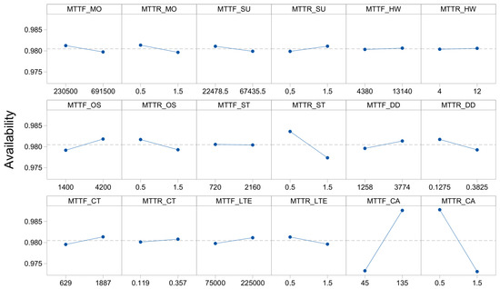 Figure 7 shows the main effects graph for the availability metric. The graph represents the availability to perform the tests at each level for each of the defined factors. In this graph, the more vertical the line, the more significant influence that factor has on system availability. As shown in the Pareto graph, in this main effect graph, the