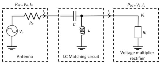 Wireless communication has been growing rapidly over the last few years and has become an essential part of people’s daily lives. The importance of wireless communication lies in enabling users to be connected anywhere at any time. However, wireless networks are also known to emit a large amount of electromagnetic energy. Most recent works are trying to use this energy [1,2]. The radio frequency (RF) harvesting system is a basic unit in wireless power transmission [3,4,5,6]. The scientific and technological advancements associated with the use of RF energy harvesting technology has become more effective. There are different external ambient RF energy sources in this modern technology, with different resonance frequencies radiating RF signals in all directions. Some of those sources are television (TV), radio broadcast, mobile phone stations, cellular phones, and wireless local area network transceivers (LAN) [7]. RF energy harvesting system focuses on the continuous assembling of RF energy from ambient sources to provide necessary DC power to low-power devices [8]. RF harvesting system consists of a receiving circuit that receives the RF signal and converts it back to a DC signal. Rectennas are used as receivers in the RF harvesting system [9] by converting RF power, PRF into DC power, PDC at a certain frequency. The energy harvesting design has been proposed [10], as illustrated in Figure 1, which shows the schematic diagram of 43 RF energy harvester. This shows the connection of the antenna to an LC matching circuit, which is connected to a voltage multiplier rectifier. The antenna comprises a voltage source (Va), a radiation resistance (Ra), which produces an antenna current Ia. The LC impedance matching is located between the antenna and the rectifier. The impedance matching circuit contains passive elements such as capacitive or inductive reactance. The matching network results in a current, IL which passes through the resistance of voltage multiplier rectifier (RL) resultant in voltage (VL). The function of matching circuit is ensuring that maximum power is transferred from the antenna to the rectifier circuit. In the absence of the matching circuit, the RF power captured by the harvester antenna will be reflected, thus little power is realized at the rectifier. Several factors affect the efficiency of the RF harvesting system, these factors include [11]: The antenna’s efficiency, where the gain becomes smaller with decrease in size, and the power efficiency of voltage multiplier. The RF to DC conversion efficiency is described as the ratio of the DC output power (Pout) to the RF input power (Pin), where RF power is the power received by the antenna, and the DC power is the output power between terminals of the load resistor which is attached to the output of voltage multiplier. Where RF power is the power received by the antenna, and the DC power is the output power calculated between terminals of the load resistor attached to the output of voltage multiplier. The voltage multiplier (η) conversion efficiency can be found in (1):
