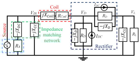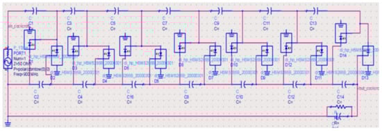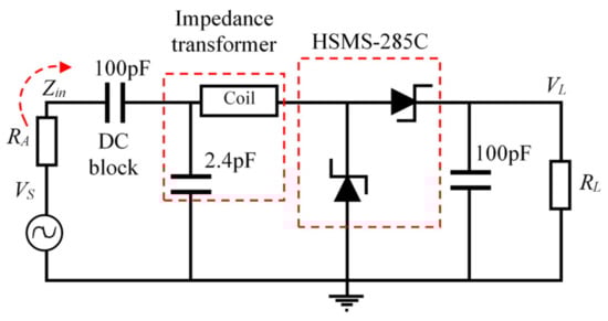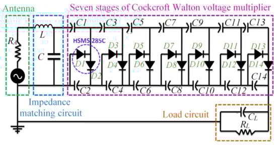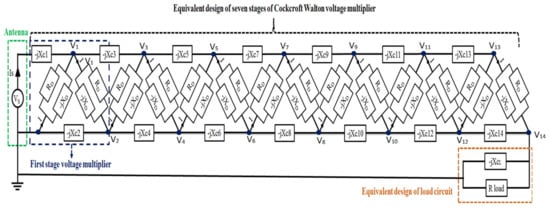 The original circuit, as shown in Figure 6, consists of the antenna, impedance matching and voltage multiplier. The main reason for choosing 7 stages of voltage multiplier is that the parasitic effect of the capacitor of each stage was increased, which accumulates and leads to a decrease in voltage gain [30,31,32]. The circuit was converted to a linearized circuit by replacing the diodes, the capacitor and inductor with their impedances, as shown in Figure 7. In general, the diode impedance is RD, capacitor impedance is -jXC, and inductor impedance is jXL. XC1–XC14 are the reactance with a value of 0.3 pF. XCL is the reactance with a value of 100 pF load capacitor. RL is the load resistance of the voltage multiplier [20].