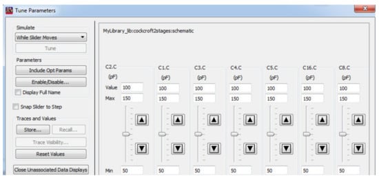 Design consideration of the rectifying antenna is illustrated in this section for Cockcroft–Walton voltage multiplier circuit, as shown in Figure 4. The capacitor and resistor load values were calculated using the tuning tool in ADS software, as shown in Figure 4. The values of capacitors are selected based on the frequency value. The values of the L-network can be calculated using the Smith chart tool in ADS software.