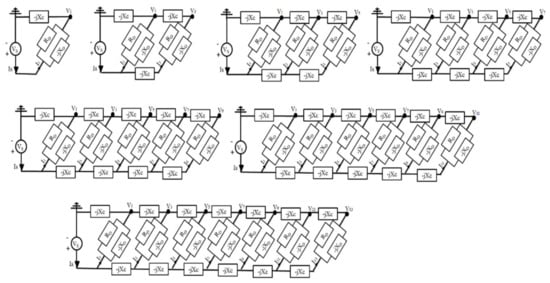The same principle applies to the values of the nodes output voltages for stages 1–7 in the first mode (V1–V13), as shown in Equations (9)–(15):
