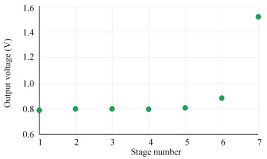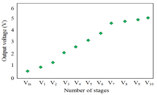 where Rn is the load resistance. An increase in the number of stages will result in an increase in the value of the output voltage and a decrease in the value of the output current at the same time. For the mathematical expression of Cockcroft–Walton voltage Equations (2)–(15) were used for the simulation using MATLAB code as shown in Figure 10. The equations were written in MATLAB with input parameters for capacitors, frequency, ZD, jXL, jXC, input voltage and current Vs, Is, respectively. Values of V1 to V7 were obtained using Equations (9)–(15). The value of the output voltage is 1.50 V, and the value of output power is 57.1 µW for a load of resistance 50 KΩ. For the proposed circuit, the seven stages model has the best performance since it has a high ability to give the best output voltage. For the proposed design at the frequency of 900 MHz, the output voltage deteriorated after stage seven, as previously mentioned in earlier studies [32]. The reason for this trend is the increasing parasitic effect of the capacitors in each stage, which accumulates and leads to decreasing voltage gain [33].