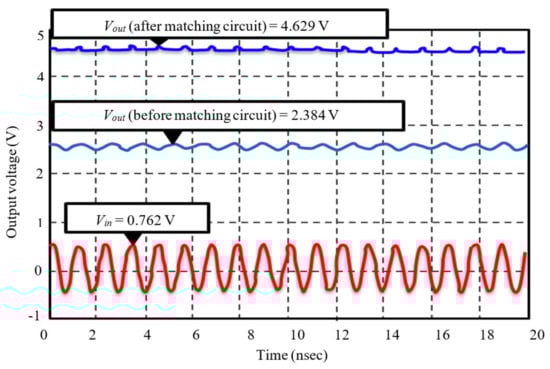 Figure 12 illustrates the simulation results for the proposed design before and after adding the matching network. The value of the input voltage (Vin) is 0.762 V, and the output voltage before adding matching circuit is 2.384 V. The value of the output voltage after adding the matching network is 4.629 V. It was observed that the output is not accurately DC voltage; it is mostly an AC signal with a DC offset voltage. The increase in the output voltage is due to the addition of a matching circuit that operates as a detector for the circuit to confirm a good transformation of the power from the antenna to voltage multiplier.
