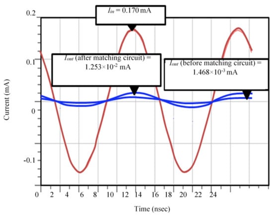 The function of the voltage multiplier rectifier circuit is to increase the output voltage value, as shown in Figure 12. While in Figure 13, it is observed that the output current decreases after seven stages (with a value of 1.468 × 10−3 mA) before adding the matching network. The output current increased after adding the matching circuit due to the decrease of the dissipated output power as a result of the influence of the matching circuit.