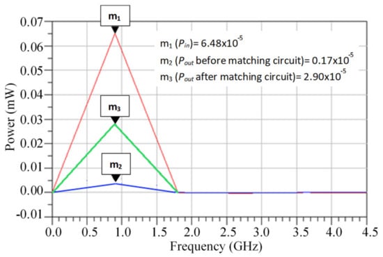Figure 14 illustrates that at 900 MHz, the input power rises to 64.8 µWatt, which is the power received by the antenna. It also observed that the output power decreased after the seventh stage to 1.7 µWatt. The dissipated power will increase by increasing the number of stages and elements. Using a matching circuit will increase the value of power to 29 µWatt, which is a positive indicator of the importance of adding the matching circuit to increase the efficiency of the voltage multiplier by decreasing the dissipated power as illustrated as well in [34,35].