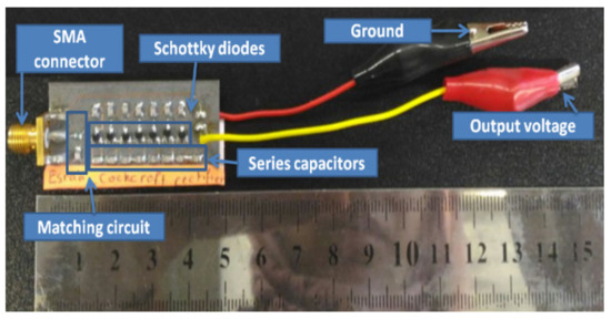 EAGLE software, which is a schematic software used for PCB design, was used to design the voltage multiplier rectifier circuits for the purpose of rectifier prototyping. Figure 16 shows the circuit schematic diagram with the computed distance between the voltage rectifier elements. The dimension of the Cockcroft–Walton rectifier circuit is 45 × 18 mm, as shown in Figure 17. The components of the circuit, such as the SMA connector, matching circuit, Schottky diodes, series capacitors and the output terminals, are highlighted in the diagram. Roger 5880 was chosen for ground plane prototyping because of its advanced capabilities to boost the output voltage, as indicated by previous studies [22]. The mounting soldering technique was used to fix the elements of the voltage multiplier rectifier.