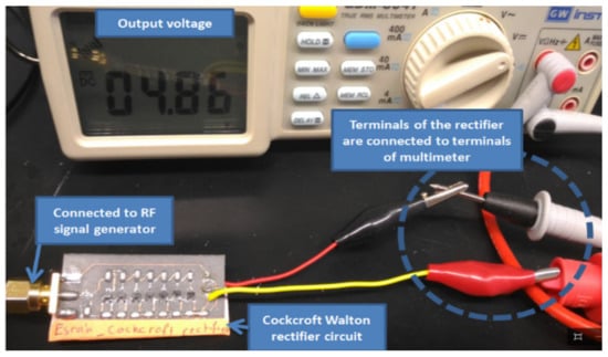 Figure 18 illustrates the testing setup for the proposed circuit. The circuit is connected to an RF signal generator, while its terminals are connected to the multimeter terminals to read the output values. The values of output voltage and current are 4.86 V and 68.73 µA, respectively.