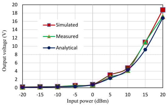 The output voltage was investigated by carrying out an analysis of the power input for the proposed design using the input power ranging from −20 dBm to 20 dBm. The values of the analytical, simulated, and measured output voltages are presented in Figure 19 for the rectifier models at 10 KΩ resistance load. As observed in the figure, the output power increased as the value of the input power increased.