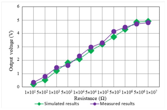 Simulated and measured output DC voltage versus the load resistance for the proposed design.