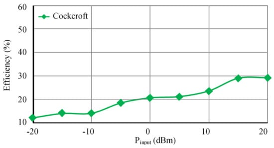 The effect of the matching circuit is illustrated to prove its ability to decrease the reflected power between the antenna and voltage multiplier rectifier by increasing the value of output power of the circuits at the range of input power. The output voltage increased by 64.02%. As the load resistance increases, the output DC voltage also increases. The rate of increase of the output voltage was higher at the lower value of resistance, as illustrated in [36]. Figure 20 shows the output voltage versus load resistance at 900 MHz. The efficiency is summarized in Figure 21 for power input range −20 to 20 dBm. Higher power input results in higher efficiency [17,18,19,20,21,23,24].