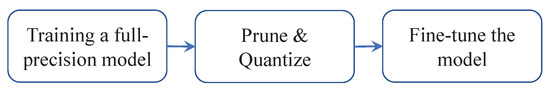 Pruning the network by using the permuted block diagonal mask matrices not only produces regular sparsity, but also eliminates the hardware overhead otherwise required to store the index regarding non-zero weights [31]. Quantization is another effective way of compressing the network. As mentioned earlier, the traditional linear quantization (TLQ) approach usually suffers from the non-convergence problem arising from the capped saturation. The normalized linear quantization (NLQ) approach, however, can, to a large extent, remove this limitation [32]. Accordingly, the entire training process will go through two phases. First, after pruned, the model is taken for training until it converges. Secondly, the model is subject to further quantization and then taken back for retraining until it converges once again.