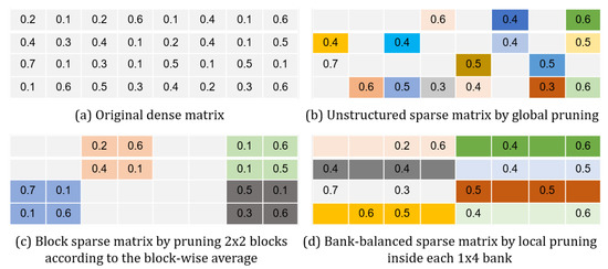 As some certain redundancy always exists in neural networks [8,9], pruning techniques have been proven effective in model compressing without necessarily degrading the performance. Unfortunately, the present weight pruning approaches all seem to have some drawbacks. Song. H. and Frederick. T. et al perform weight pruning by following the “smaller-norm-less-important” criterion, which suggests that weights with smaller norms can be pruned safely due to their insignificance [10,11,12,13]. Xin. D. and Pavlo. M. et al. heuristically search for trivial weights to be eliminated [14,15]. As illustrated in Figure 2b, these two approaches are generally prone to generating undesired irregular sparsity, which makes hardware design less efficient. Sharan. N. proposed the coarse-grained pruning method targeting all the weights in a block-manipulated fashion, surely delivering regular sparsity, but at the expense of the model accuracy (see Figure 2c) [16]. Referring to Figure 2d, Shi. C. divides each weight matrix row into a plurality of those equally sized banks (marked with different colors), and separately prunes each bank at fine-grained level [17]. This way, the same degree of sparsity across all the weight matrices can be obtained. Seyed. G. proposed a similar solution, which is pruning the model to obtain a row-balanced sparse matrix [18]. However, the address pointing to a non-zero weight position in their solutions becomes unpredictable and requires separate memory for storage.