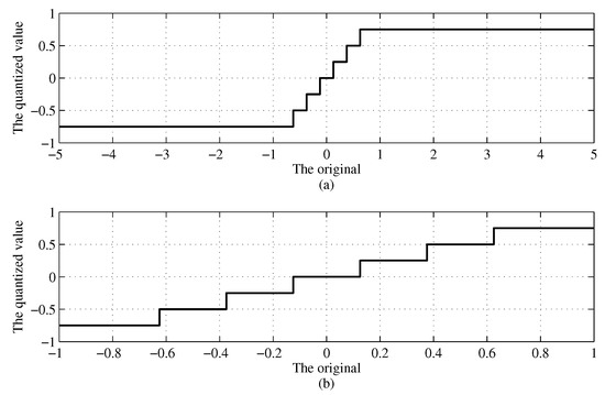 Quantization is another effective means in network compression. Itay. H. quantizes all the weights in binary, which has only two values, namely −1 and 1 [19]. In order to enhance the digital representation for better precision, Chenzhuo, Z. quantizes all the weights in ternary, yet still not sufficiently enough when dealing with some complicated tasks [20]. Shuchang. Z. devised some approaches of quantifying the weights and the activations to any-bit values [21]. In their approaches, an operand will be quantized within the range of and otherwise saturated outside of this range. As shown in Figure 3a, for those operands far greater than 1 in value, even if the straight-through estimation [21] is applied regarding the gradient, such a way of truncation could still nullify some of the gradients according to our experimental results presented in Table 3, leaving the network hard to converge. As a consequence, this type of quantization is not performing well on some certain tasks. To rectify, Jungwook. C. proposed to limit activations within the range of , where is a trainable parameter [22]. However, this approach is only applicable to the quantization of the activations rather than the weights.