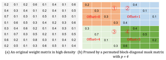 where , , and p is the rank of the sub-matrices. The numbers of sub-matrices represent all the permuted block diagonal mask matrices used. Then, the pruned weight matrix can be obtained below: