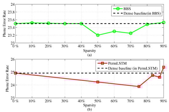 Phone error rate vs. sparsity on the TIMIT dataset. (a) Evaluted on Bank-Blanced Sparsity (BBS). (b) Evaluted on PermLSTM.