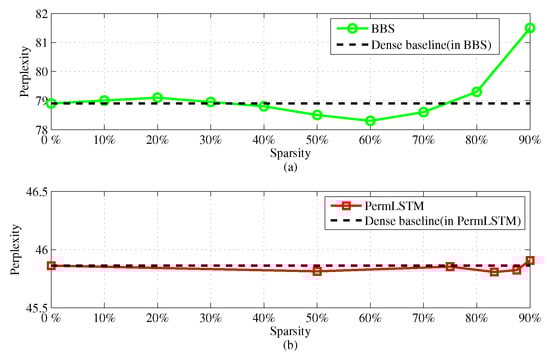 Perplexity vs. sparsity on the Penn Treebank (PTB) dataset. (a) Evaluted on BBS. (b) Evaluted on PermLSTM.
