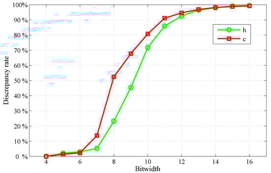 The discrepancy rate vs. the bit-width, to characterize mismatch between the PLAed activation function and its quantized operand.