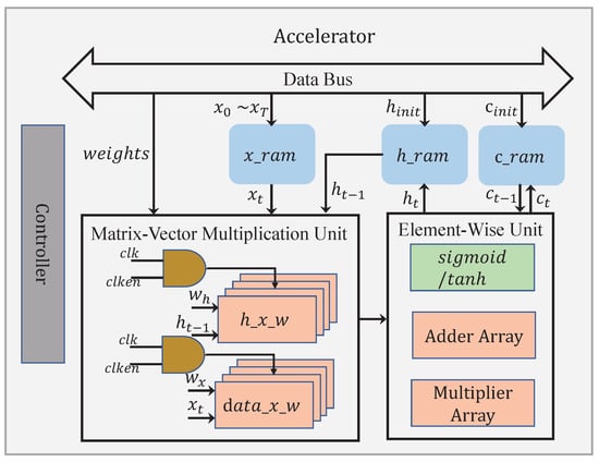 An architecture diagram for the proposed accelerator is shown in Figure 10. The accelerator has two main functional blocks, namely the matrix–vector multiplication unit and the element-wise unit, containing all the basic operations required by the LSTM. The matrix–vector multiplication unit is primarily responsible for the computations regarding and defined in Equations (1)–(4), where . As and are usually differing in dimension, the run times required to complete these two categories of multiplications are different. By exploiting the waiting intervals for the sake of energy saving, our architecture has two separate modules, i.e., and , dedicated to accomplishing and , respectively. When , will be read from at a later time, in a way to align the finishing time for both matrix–vector multiplications. During the time before the next is read from , the module is idle, with its clock disabled. When , it should be the other way around. This time, reading from is being delayed until a later time, in the meantime setting the module at idle. By doing so, a big chunk of the total dynamic power consumption can be effectively cut off. For example, in a typical word sequence generation case, the difference between m (e.g., 27) and n (e.g., 256 or 512) could be quite large, benefiting the energy savings to a large extent. Note that the element-wise unit performs the element-wise addition, the element-wise multiplication, and the activation function.