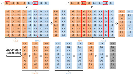 As for the activation, the accelerator has been designed to calculate the matrix–vector multiplications in a column-wise fashion, as depicted in Figure 11. As long as an activation is zero, the subsequent multiplications involving and will be bypassed. Here, represents all the weights from a corresponding column. Figure 12 illustrates the processing flow executed in module . Along the way, m activations are being fed into over clock cycles.