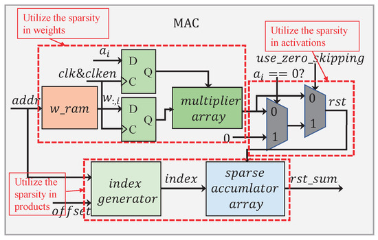 The MAC submodule has a processing flow as given in Figure 13. In order to reduce the memory footprint and lessen the multiplication operation, we developed a memory-accessing strategy by catering fully for the weight sparsity. As illustrated in Figure 14a, only non-zero weights at the same column in the matrix are stored along a single row in the memory, facilitating for them to be read once a clock cycle.