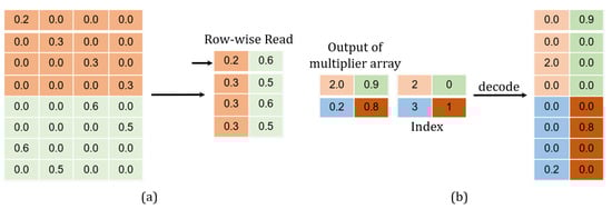 In (17), the term calculates the longitude coordinate for all the non-zero weights in a relevant sub-matrix. Since the non-zero values belonging to the same column in the weight matrix are stored along a specific row in the memory , j is then regarded as this row’s address (). As for the offset, it can be decided just by a calculation of , considering that . The module takes such a differentiation route to determine all the locations regarding the non-zero products, e.g.,