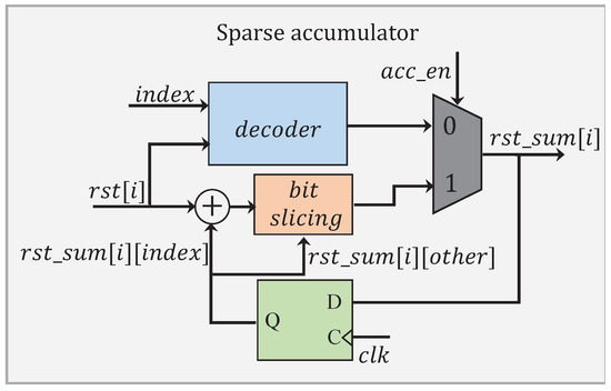 The module has a processing flow as depicted in Figure 15. When an accumulation is not required, the signal is set to 0. This allows for performing only the decoding operation, which has been illustrated in Figure 14b. The non-zero product is decoded in a format of . A total of p accumulated results are individually concatenated into bits in the representation. When the accumulation is required, the signal is set to 1. Instead of performing all the p additions, only those additions involving and the corresponding contents in are processed. The intermediate results obtained are later stitched up with the others in to complete a full accumulation.