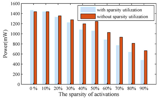 Assume the sparsity ratio regarding the activation () be 50%. According to (20), the activation-sparsity related multiplication reduction rate () is 0.125 (1/8). This further reduces the multiplication runs. As a result, the power consumption is once again decreased by 188 mW.