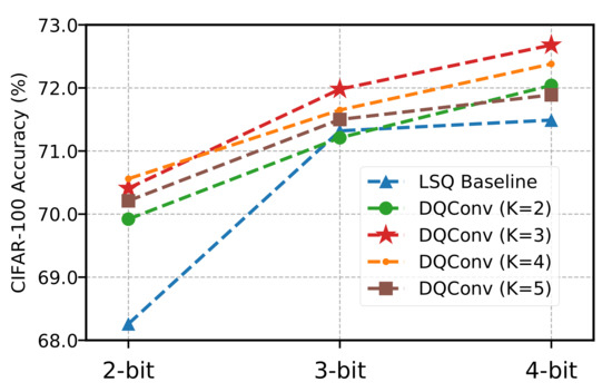 To demonstrate the effectiveness of our dynamic quantized convolution, we evaluated it on the CIFAR-10 and CIFAR-100 [63] datasets with ResNet-20 and ResNet-32, respectively. The CIFAR10 dataset contains 60,000 32 × 32 color images of 10 different mutually exclusive classes. The CIFAR100 is similar but contains images from 100 classes.