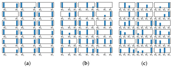 The attention output distribution over 2 experts (a), 3 experts (b), and 4 experts (c) of different layers in the 4-bit quantized ResNet-32. The y-axis denotes the selection probability.