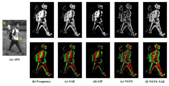 However, the NSTS encoding method seems to pay too much attention to the contours of the moving objects so that the representation of the internal details of the object (such as the pedestrian A) is not as complete as SAE and Frequency. Therefore, the target in the NSTS event-frame usually has only contour lines and exhibits less hierarchy. We learned from the popular “attention mechanism” concept in deep learning [20,21] to enhance the internal detail feature information by introducing the SAE encoding method to describe the texture details of the target and fusing it with the NSTS coding method. Comparing the visualization results are shown in Figure 1e,f, it can be found that the texture details, such as the shoulders and backpacks of pedestrian A in the mixed event-frame NSTS–SAE, are much richer and more complete than in NSTS. At the same time, the pixels belonging to pedestrian B still retain sufficient contrast. Visually, NSTS–SAE brings a strong sense of hierarchy. It can be seen that the “attention mechanism” in event-frame reconstruction is conducive to making full use of the information in the event stream.