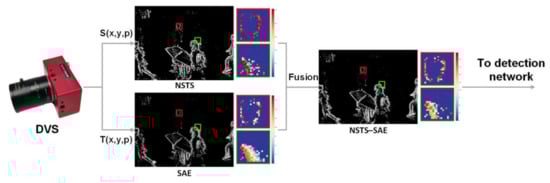 The overview of the event integrator with NSTS–SAE (neighborhood suppression time surface-surface of active events) fusion. Event integrator first encodes the event output in the dynamic vision sensor (DVS) into with NSTS method as formulated in Algorithm 1. Then, the NSTS result is fused with the intermediate variable in the encoding process regarded as the SAE event-frame. Finally, the fusional NSTS–SAE event-frame is used as the input of the detection network.