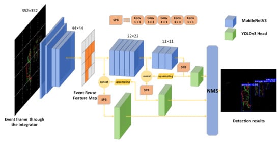 The original event stream is encoded into an event-frame image by an event integrator, and the event stream-based pedestrian detection task is transformed into a conventional frame-based object detection task. Among the object detection approaches in the field of computer vision, the YOLO detector has received much attention from researchers and engineers since its inception [22]. Its latest achievement, YOLOv3, offers significant advantages in detection accuracy and speed in multi-target detection tasks [23].