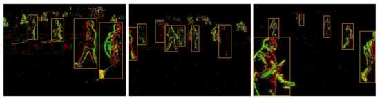 As far as we know, the datasets based on DVS are currently much scarcer than conventional cameras in the field of object detection. Especially, there is no fully public labeled dataset for pedestrian detection. Although several event-based pedestrian detection studies have been conducted [12,13], the datasets they used are not publicly available. Hence, we collected about 6.5 h of event streams with the help of the DAVIS346 event sensor (iniVation, Zurich, Switzerland). DAVIS is a composite sensor that combines event-driven asynchronous readout of temporal contrast with synchronous frame-based APS readout of intensity [25]. The resolution of this event camera is 346 × 260. The dataset contains multiple real-world pedestrian scenarios, including campus roads, traffic intersections, subway station exits and pedestrian crossings. We collected 141 short event streams with a total of 488 s, including 84 M events, to construct an event data-based pedestrian detection dataset named Pedestrian-SARI (Shanghai Advanced Research Institute). Among them, 107 event streams are used as the train set, and the rest are used as the test set. Each event stream clip is converted into corresponding event frames and annotated manually to record locations of pedestrians as well as the label. In total, 6061 event frames reconstructed with a temporal window of 40 ms are annotated. Figure 4 shows some examples from the pedestrian-SARI dataset.