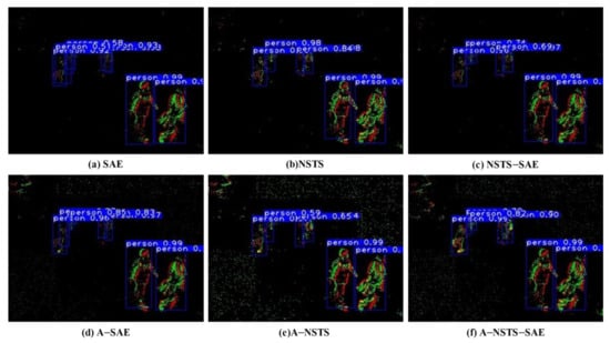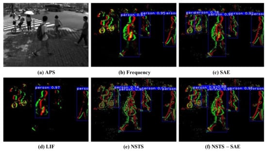 The visualized pedestrian detection results from the detectors are presented in Figure 5. As shown in Figure 5a, this is a typical traffic road crossing scene. Interestingly, comparing Figure 5c,e can clearly that NSTS and SAE focus on the different locations, so the fusion of NSTS and SAE event frames can complement each other. Therefore, the results from NSTS–SAE were superior to others.