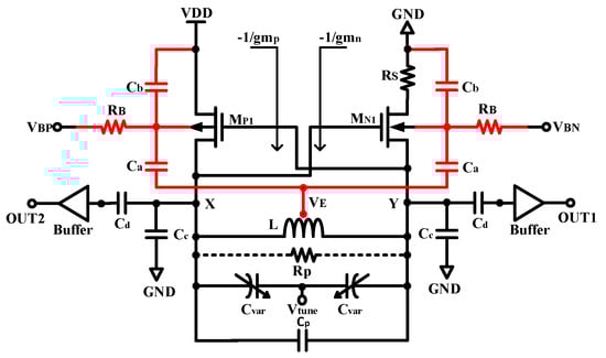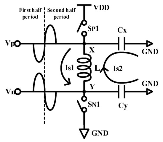Before discussing the principle of the back-gate-biasing technique, it is worth introducing the behavior model and parasitic effect of current-reuse VCO. The behavior model of current-reused VCO is depicted in Figure 3. The circuit can operate in two states periodically. MP1 and MN1 can be simplified as switches, SP1 and SN1. Additionally, and represent equivalent capacitors in node X and node Y, respectively, including parasitic capacitors connected to LC-tank. The oscillation frequency is shown as follows: