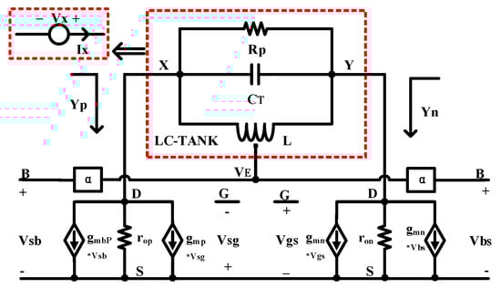 Here, the LC-tank is represented as the source. is the current flowing through LC-tank and is the voltage at its both ends []. The effective admittance can be calculated as follows: