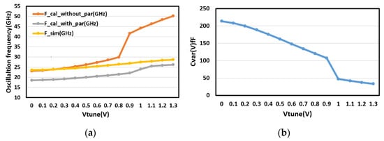 It can be seen that the parasitic capacitance introduced by the gate-drain capacitance is the largest. Therefore, in the circuit layout design process, the layout should be optimized to reduce the gate-drain capacitance. Assuming that the outputs nodes and are equal, the average capacitance of varactors equivalent to the LC-tank is . The comparison of calculation and simulation results with different tuning voltages, as shown in Figure 4a. When considering parasitic capacitance, the calculated frequency will be lower than the simulation results. On the contrary, the calculated frequency will be higher than the simulation. However, the error will increase in the high frequency cases. Figure 4a shows that there is a certain error in the model in the high frequency range. After considering the parasitic capacitance, the trend of calculation results is close to the simulation results. Figure 4b shows the average capacitance that varactors variate with tuning voltage. As increases, will decrease. This can explain why the frequency will drop as the tuning voltage increases.