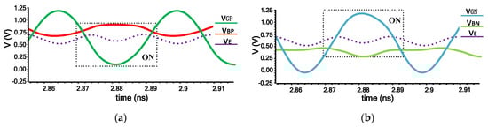 The proposed VCO employs a capacitive divider to extract the error voltage VE which is passed to the bulk of negative device, so the threshold voltage periodically varies with output voltage. To explain in more detail how threshold voltage changes, Figure 6a,b show the transient simulation of PMOS and NMOS, respectively.