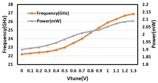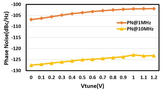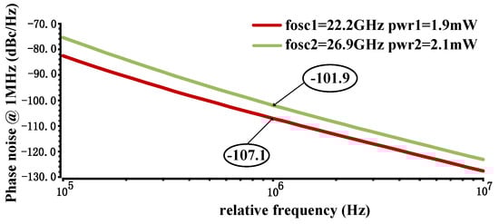 As shown in Figure 8, the phase noise at 1 MHz offset is −101.9.4 dBc/Hz at 26.9 GHz and −107.1 dBc/Hz at 22.2 GHz. In mm-wave, Q of varactors greatly limits the performance of VCOs. When the MOS varactors are working in accumulation region or depletion region, the Q of the capacitor is proportional to and , respectively []. To optimize the phase noise, the channel length should be the shortest.
