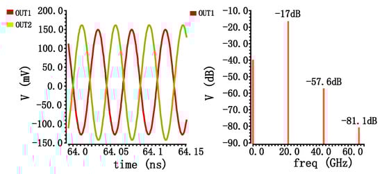 When the VCO operates at the lowest operating frequency of 22.2 GHz, it has the minimum phase noise of −107.1 dBc/Hz and the lowest power consumption of 1.9 mW. The transient simulation is depicted in Figure 9. The proposed structure has an asymmetry differential output with an output swing of around 300 mV. The imbalance of outputs will affect the phase noise performance, so a more effective way to improve the symmetry of current-reused topology is needed. From the spectrum of output waveform, the total harmonic distortion (THD) can be calculated. Since the fundamental wave is much larger than the third harmonic, higher harmonic components are ignored and the THD can be regarded as the difference between the fundamental wave and the second harmonic component. When VCO operates in the lowest frequency. The approximate value of THD is −40.6 dB.