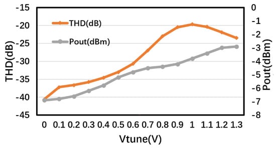 Figure 10 shows a measured operation frequency and power consumption in different tuning voltage from 0 V to 1.3 V. As shown in Figure 11, the output power is positively related to the tuning voltage Vtune, but the THD will deteriorate due to the increase in frequency. The proposed circuit has a THD performance of−40 dB~−19.7 dB and an output power of −6.9~−2.9 dBm over the tuning range.