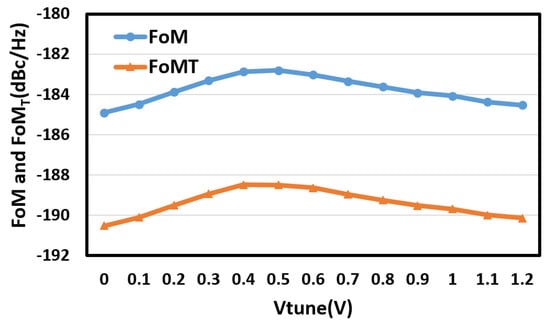 Figure 12 presents the phase noise at 1 MHz and 10 MHz offset across the tuning range. To measure the overall performance in terms of operating frequency, phase noise, power and tunning range, whilst FoM and FoMT are defined as shown in Table 1 and shown in Figure 13. At 1 MHz offset, the FoM can changes from −182.8 dBc/Hz to −185.1 dBc/Hz over the whole tuning range, while the FoMT is 5.6 dB lower than FoM. The larger the absolute value of FoM and FoMT, the better the overall performance will be. If the VCO can operate in mm-wave with low power consumption, low phase noise and wide tuning range, an excellent FoM and FoMT can be achieved. However, due to the limitations of passive components and the parasitics parameter, high FoM and FoMT are difficult to realize.